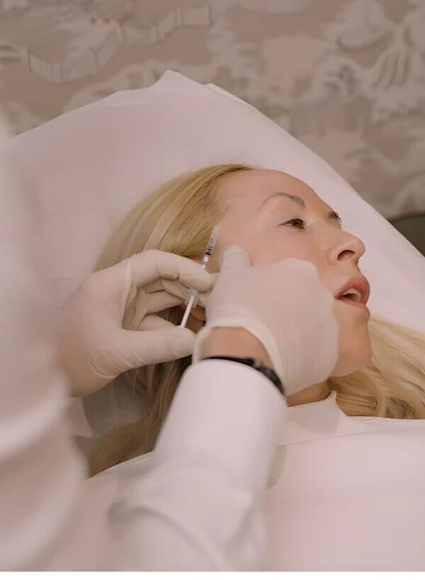 Sculptra injection points are carefully mapped. A topical anaesthetic is applied. The product is injected strategically to stimulate collagen in targeted areas.